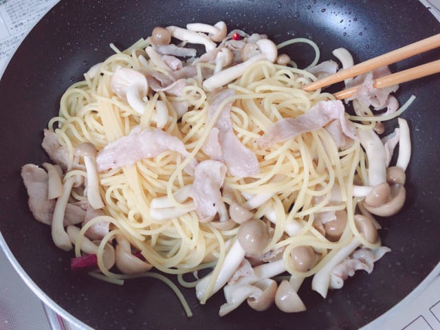 ここにさっきの鍋で茹でたパスタをドーン!茹で時間すくなめ