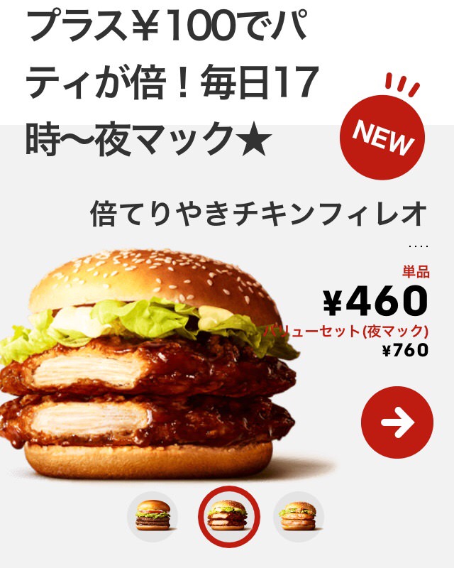 倍ハンバーガー、倍チキンクリスプは単品を2個。他にもハンバーガーを単品でもう1個買った方が、お得なのもあるのでは?。