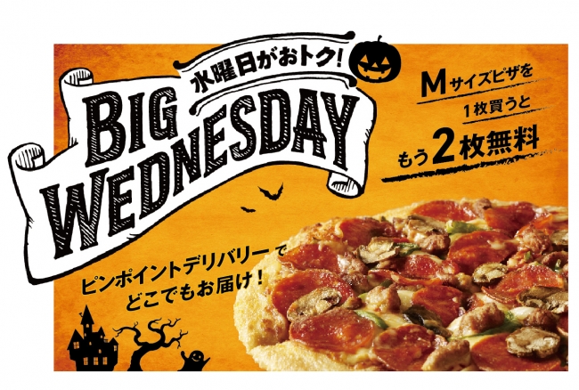 ドミノ・ピザジャパンは10月31日限定で、1枚買うともう2枚が無料になる「BIG WEDNESDAY」を実施する。つまり1枚分の値段で、3枚購入できるというキャンペーンだ。