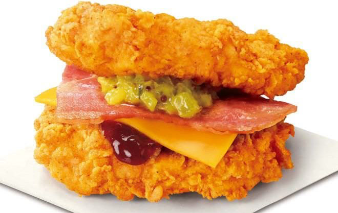 「オリジナルチキン」同様にカーネル・サンダース秘伝の味付け、調理法で仕上げた肉厚なチキンフィレ(鶏胸肉)一枚肉を2枚使用してバンズ代わりにし