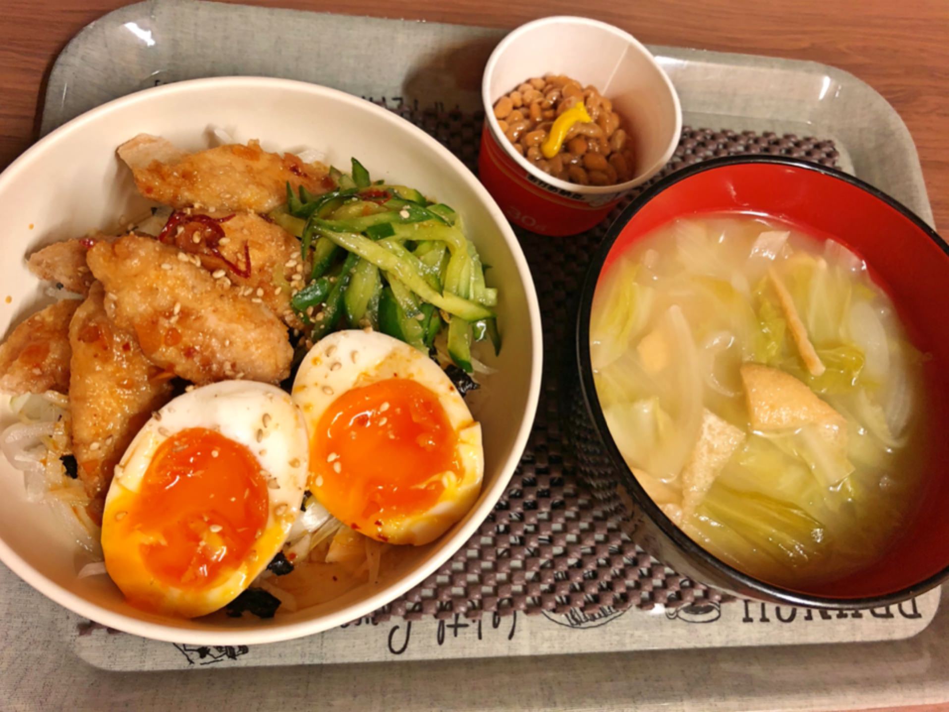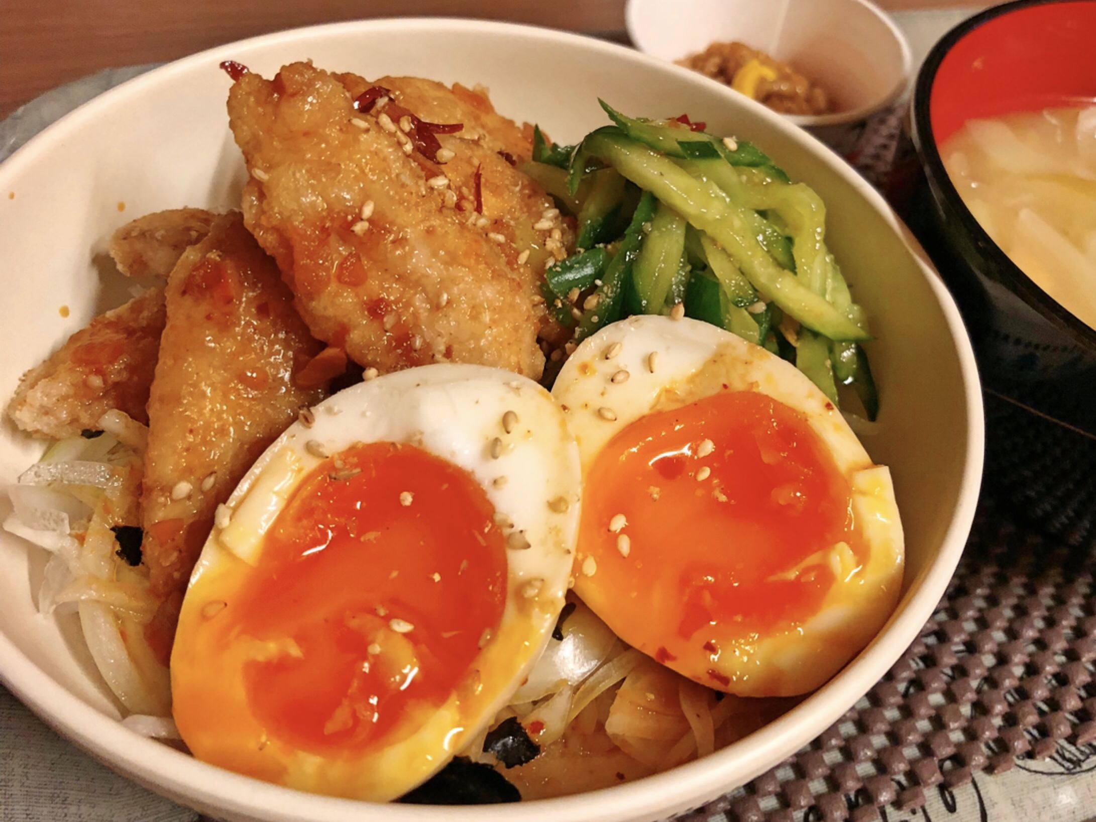 ササミの竜田揚げと味玉とキュウリ塩もみしてごま油で和えたの用意して