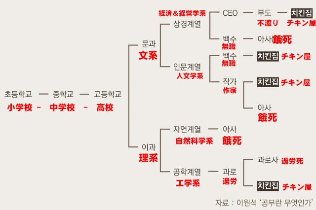 韓国メディアの東亜日報がチキン屋の実態を報じた。学歴が高卒(以下)であればどのに行こうが最終的にはチキン屋になるか餓死するか過労死するというチャートを纏めたもの。