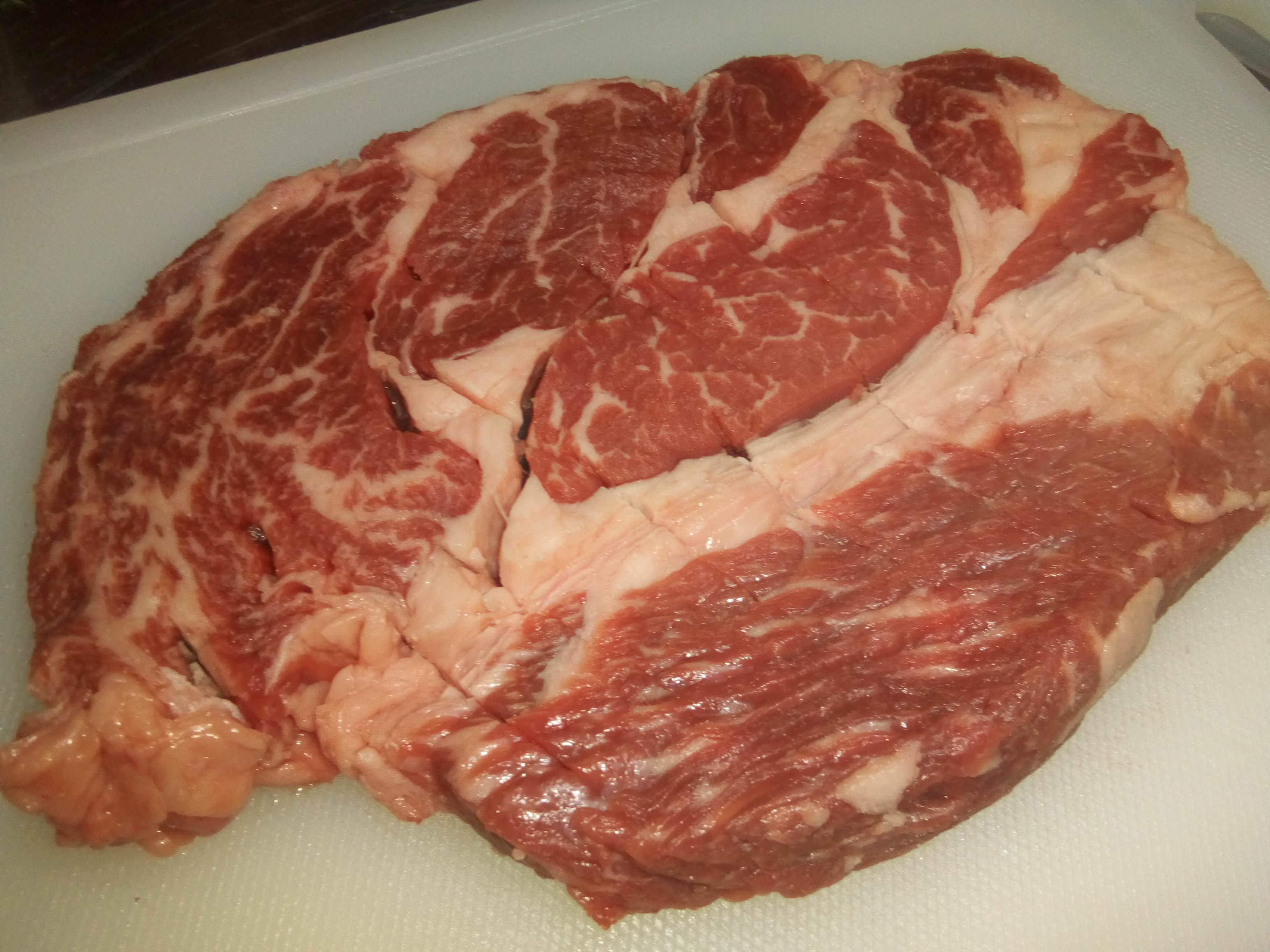 肩ロースはだいたいこんな脂身のつき方したのが西友に並んでるから写真だけでもなんとなくわかる