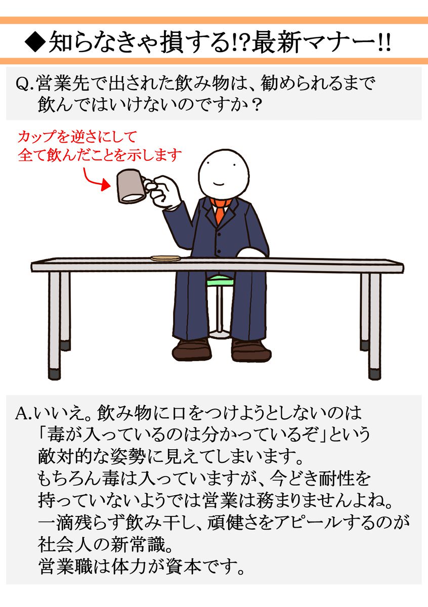あと客先で出されたお茶を飲んではいけない理由も教えてくれ未だに理解できん