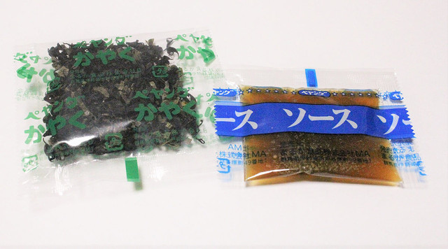 ふたを開けて、かやくとソースからチェックしていきましょう。海藻たっぷりのかやくは、濃い緑一色で「海藻MAX」を謳うのも納得です。
