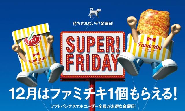 「SUPER FRIDAY」は2016年10月から開始したキャンペーンで、今回はファミリーマートの看板商品「ファミチキ」(税込180円)1個が、12月7日、14日、21日、28日に店頭での会計時に、ソフトバンクから配信されたクーポンを提示するともらえます。利用可能時間は7時~23時59分です。