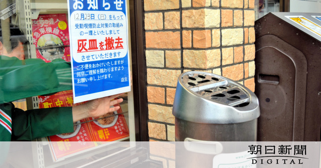 「灰皿を撤去させていただきます」。葛飾区内のセブンイレブンに男性経営者(60)が貼り紙をして告知したうえで、23日に撤去した。