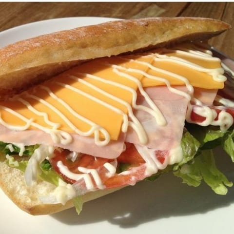 フランスパンにマスタードマヨネーズでハム、きゅうり、チーズ