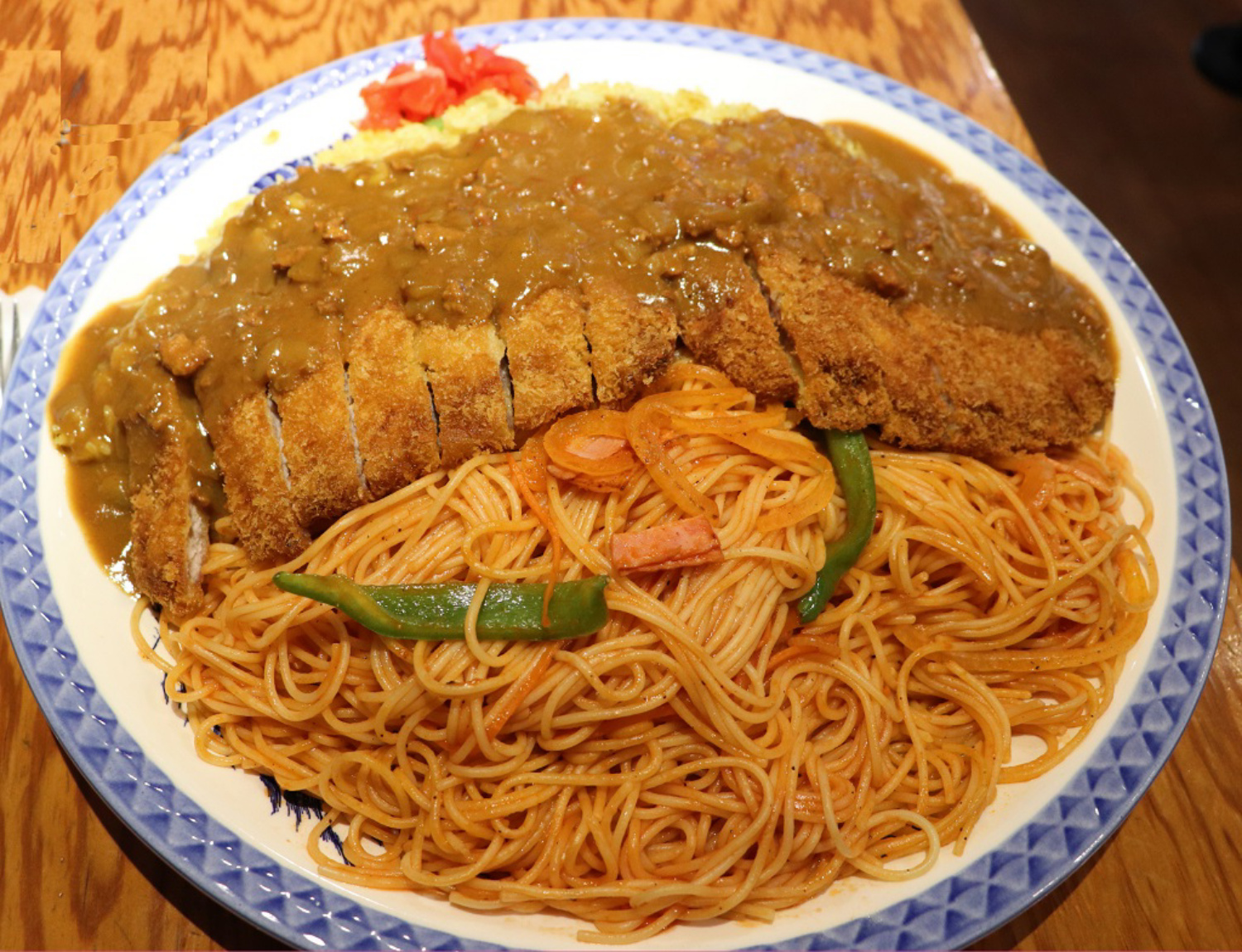 スパゲッティ、チャーハン、トンカツ、カレーのせ