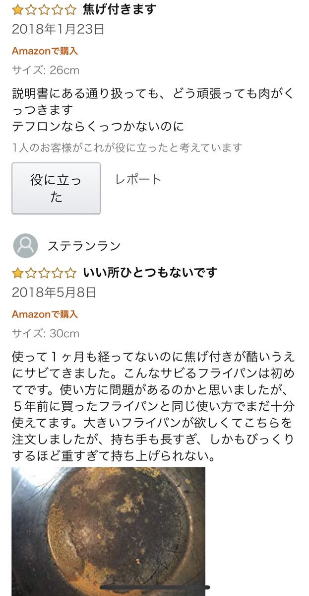 低評価コメには大抵鉄製のフライパンは云々のツッコミ入ってるのにそれを見ずに同じ内容書いてるような奴ら擁護してどうすんだ?