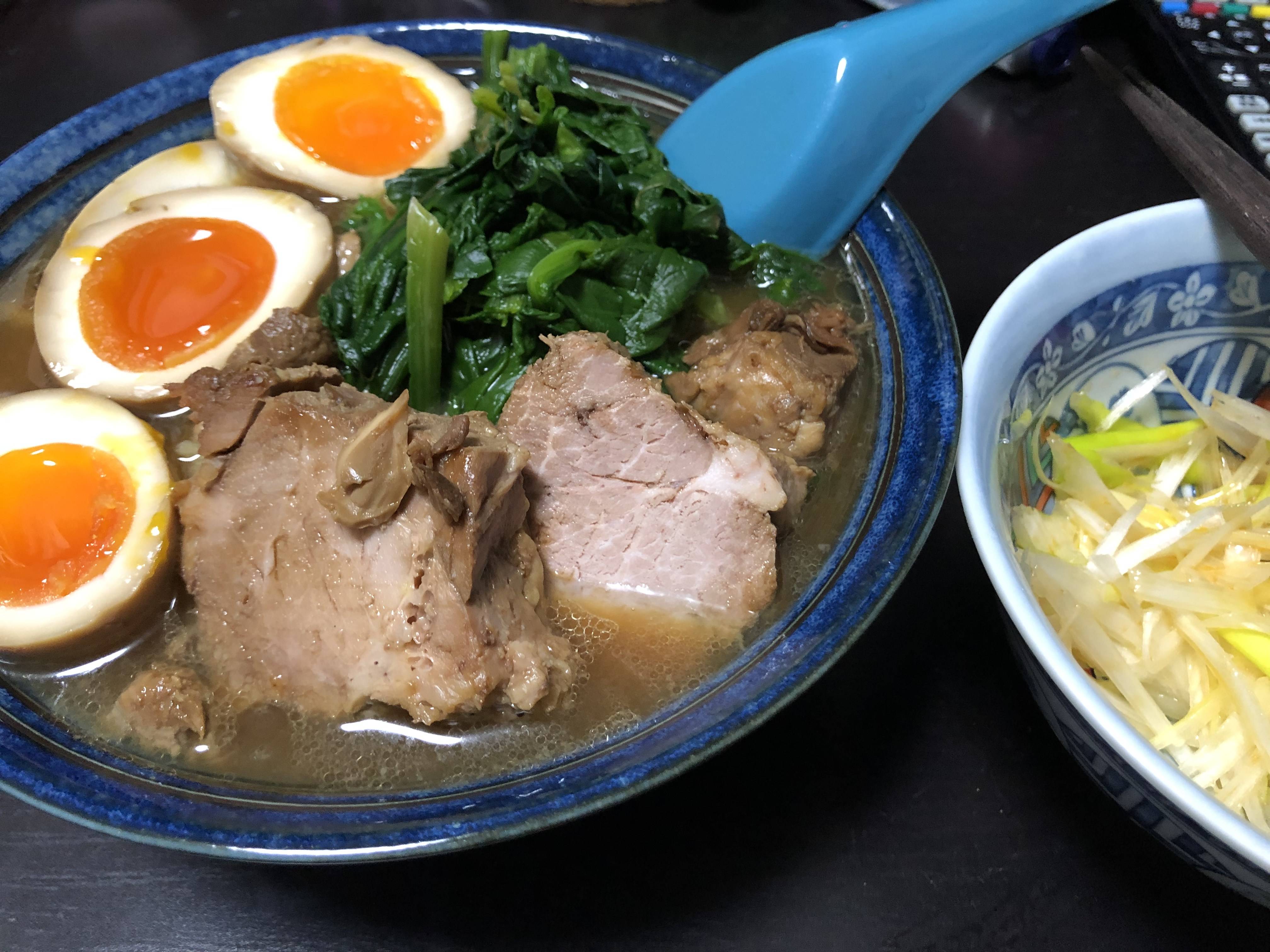 煮卵とチャーシューは一つでエエ、ほうれん草は多めで頼む