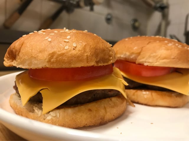 はじめはパテだけ、チーズたしたらいい、トマト入れたらgood 次はレタスかな