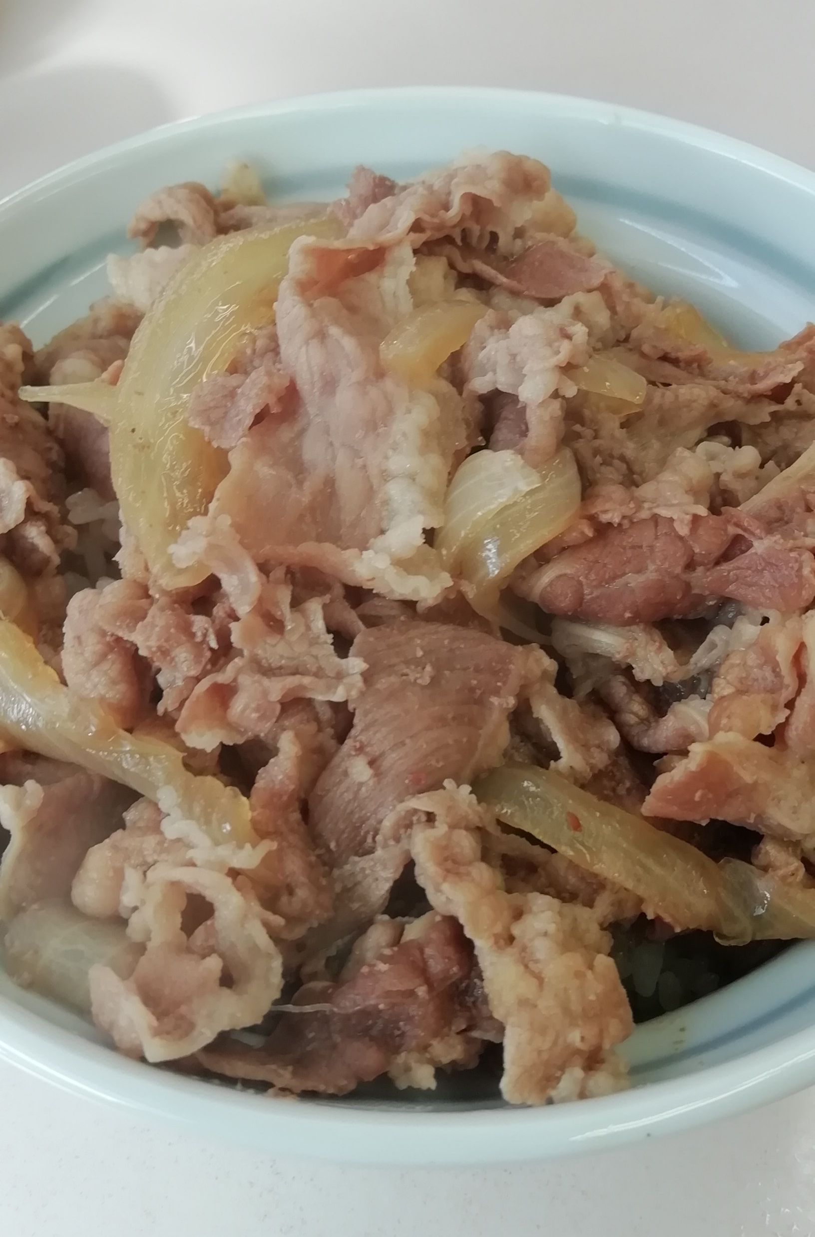 ちなみに吉野家の並盛の肉量65gは良心的なほう、肉2切れと玉ネギ大量ということもある