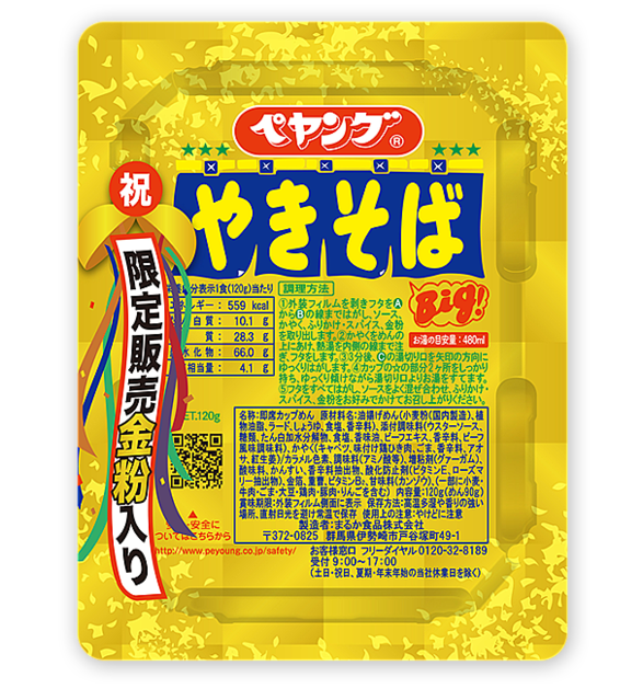 ペヤング ソースやきそば 金粉入り2019年4月8日(月)に発売 パッケージも金粉にちなんだ金色デザイン。金箔が加わった本商品の価格は250円(税別)と、通常のソース焼きそばよりも80円高いリッチなペヤング。 http://news.livedoor.com/article/detail/16212169/?_clicked=social_reaction