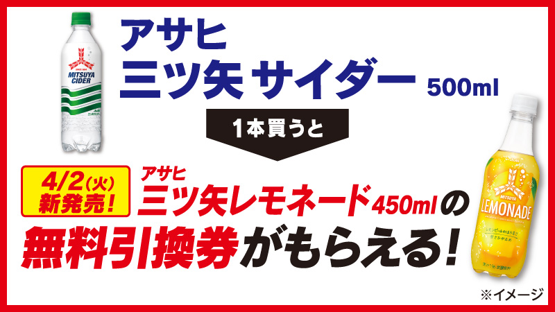 対象のアサヒ 三ツ矢サイダー500mlを1本買うと「アサヒ 三ツ矢レモネード450ml」1本と交換できる「レシートクーポン(無料引換券)」が発行されます。