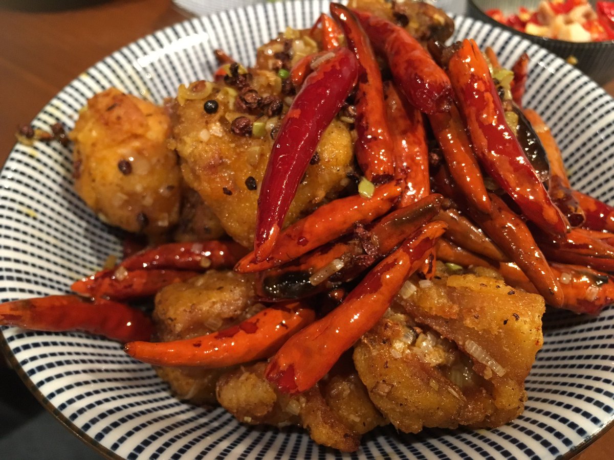 日本では「骨なし・衣付き」の店が多いが、本場中国の油淋鶏は「骨付き・衣なし」の店も多いんや。