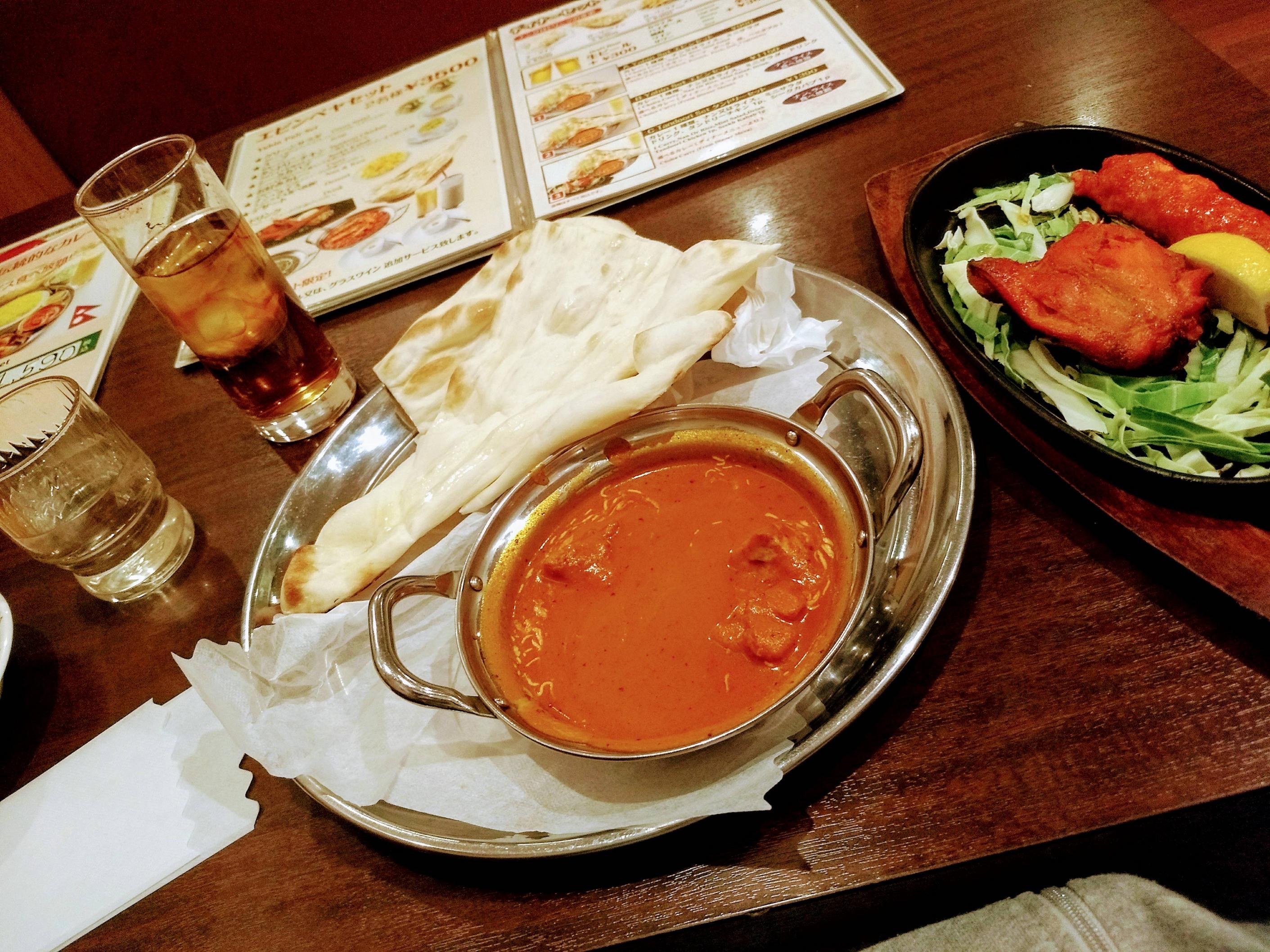 1200円でカレー3種とナン、スープ、チキンティッカ、サラダ食べ放題のとこあるわ