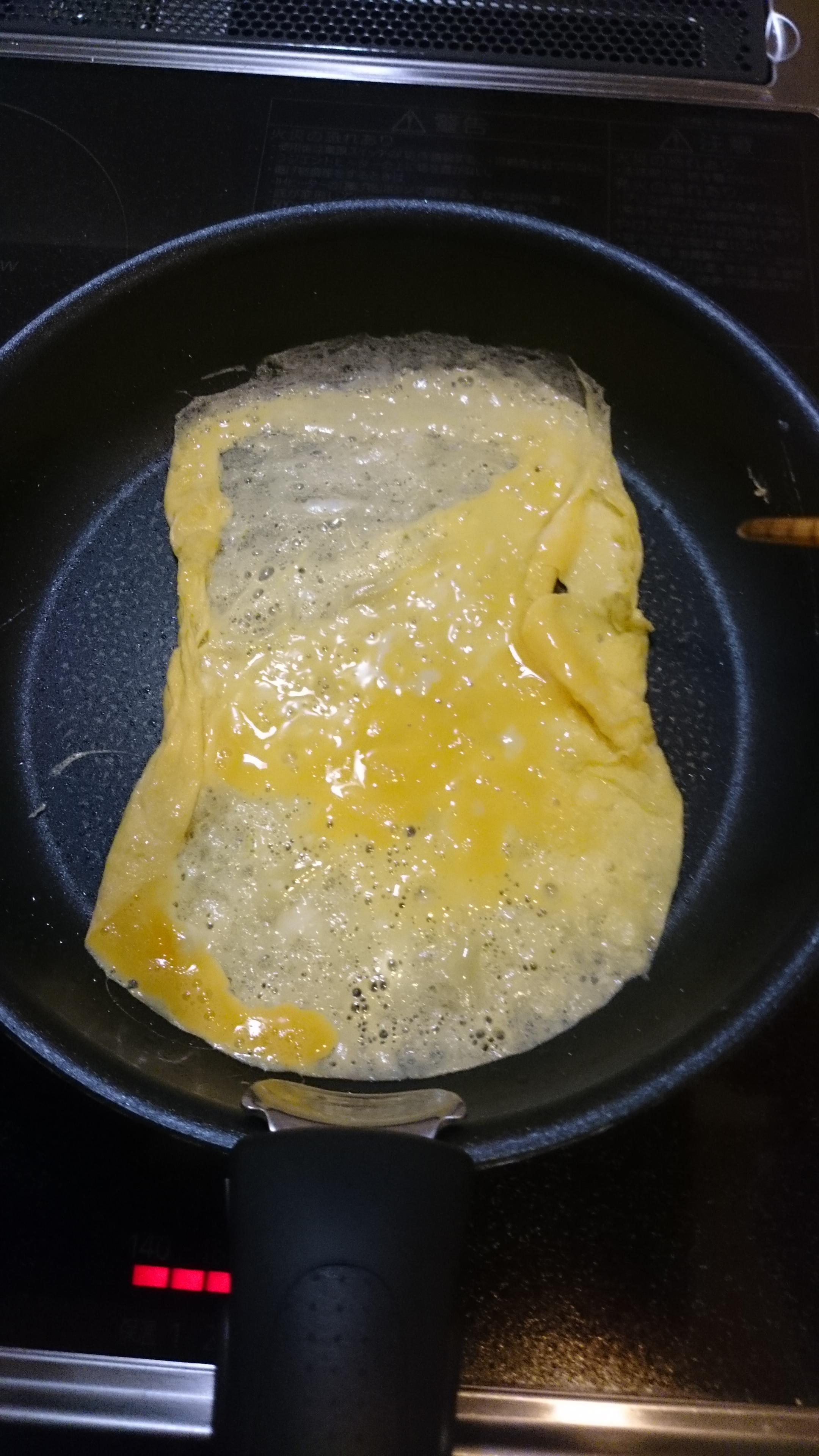 固まってから巻くと卵巻きになるので、トロっとしてる状態でとにかく巻け