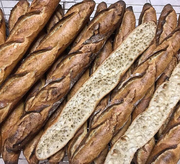 もちろん伝統手法の古き良きフランスパンは高温でしっかり焦げる直前まで焼くから、しっかりしたこげ茶色で1の写真みたいな焼き上がりになる