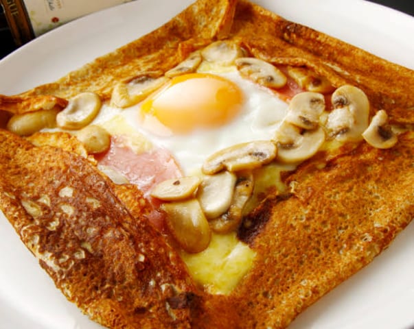 半熟の卵とチーズとハム、それを包む蕎麦のクレープの食感が良いんだよ