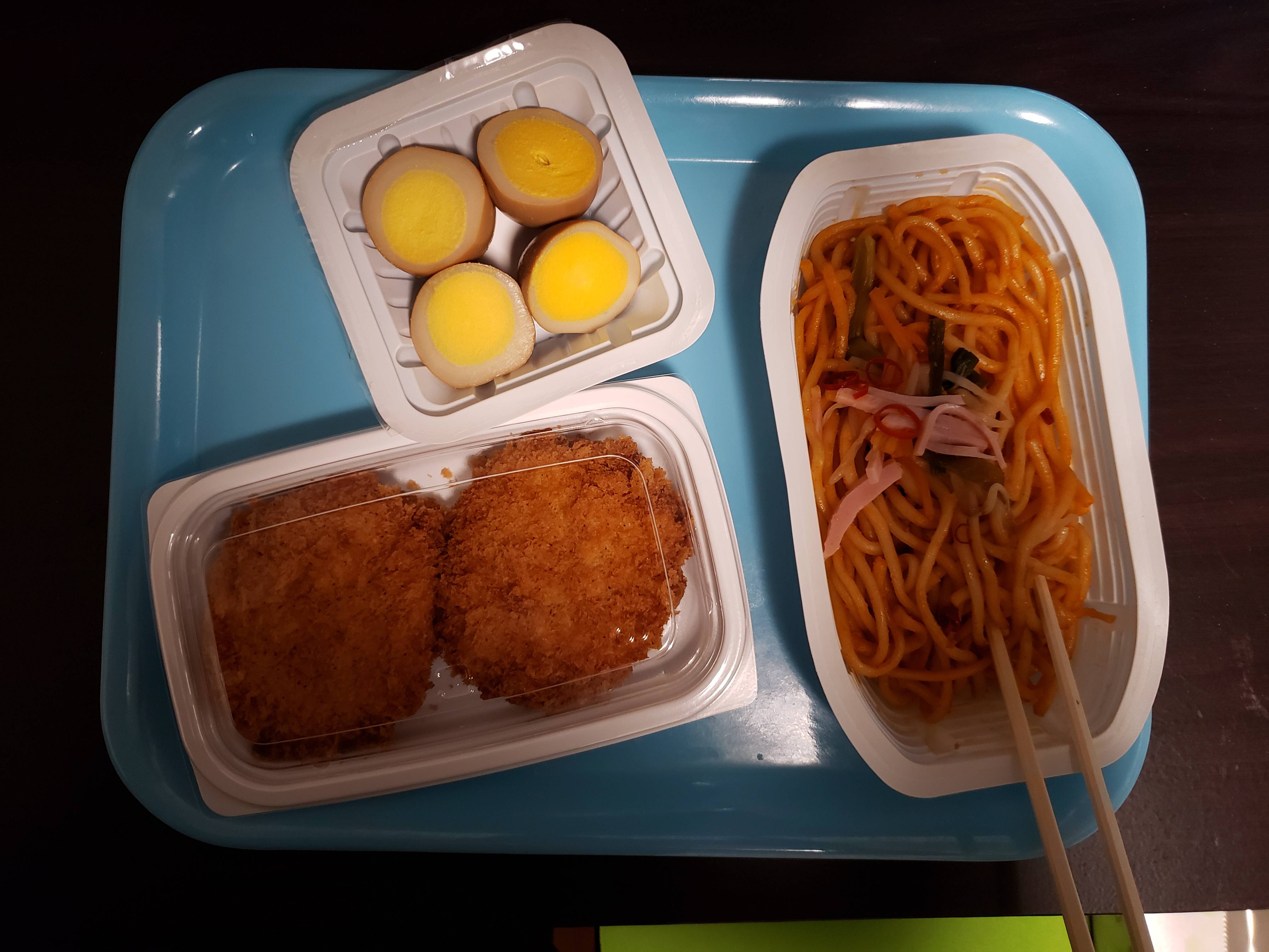 ナポリタンちょっととコロッケとゆで卵の炭水化物ばっかで360円だと割高に感じるわ 720円出せばもっと良いもん食えるのに