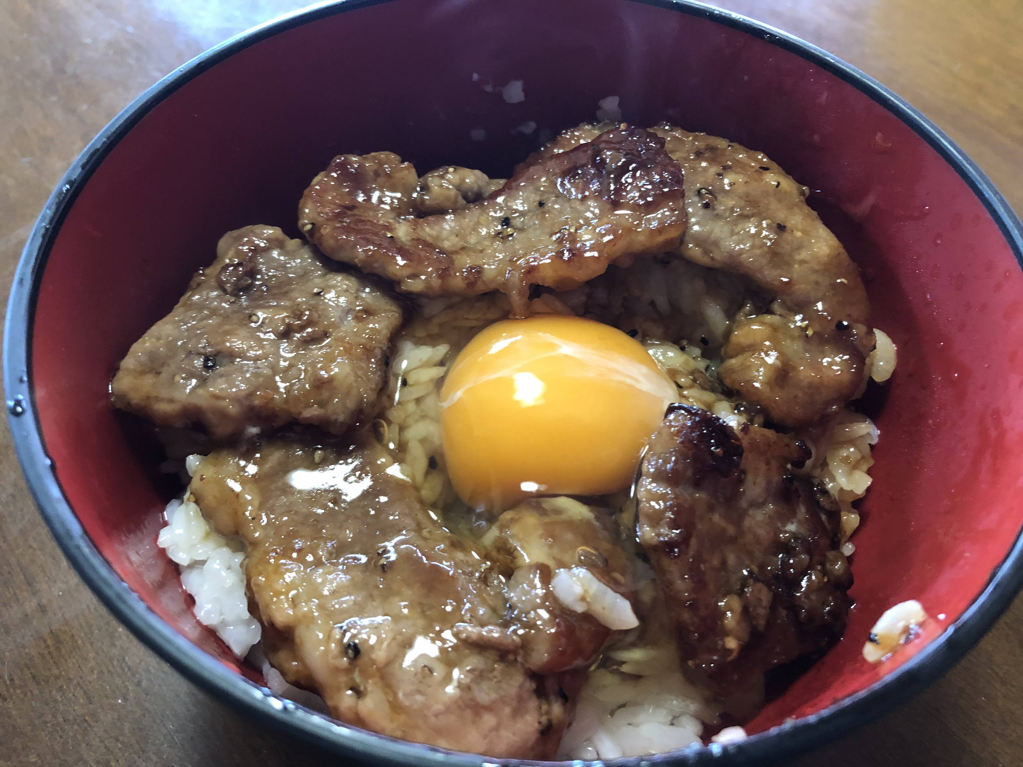 塩胡椒で濃い目に味付けして焼肉のたれで甘辛く焼いた肉をご飯にかけ、卵を乗せる まずは肉とご飯だけで食べる そのあとに卵を絡めまろやかな風味を楽しむ こういうのでいいんだよこういうので