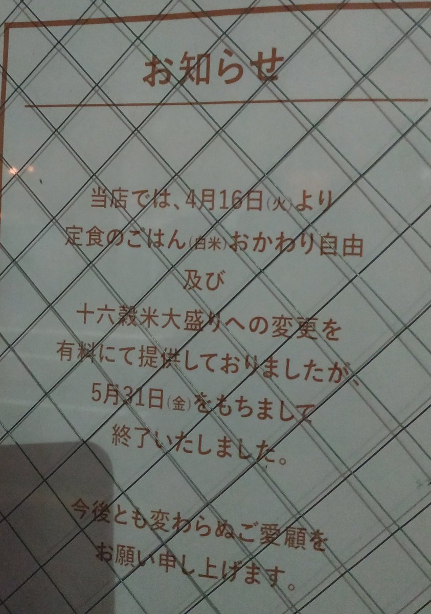 「おかわり有料化を終了しました」なんて面倒な言葉で書かずに「おかわり無料に戻しました!」って書けばいいのにって思うんだが