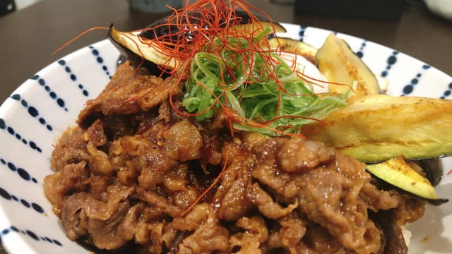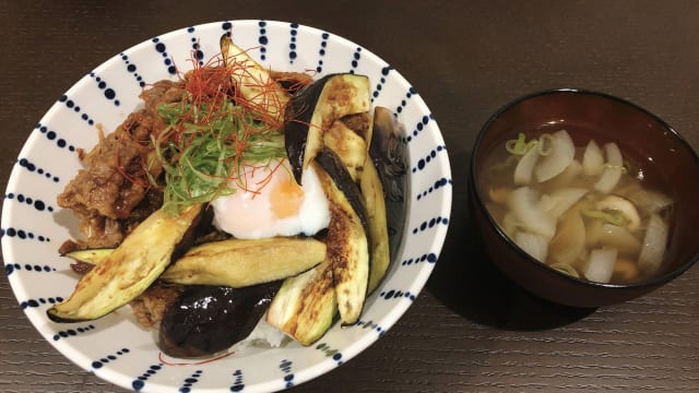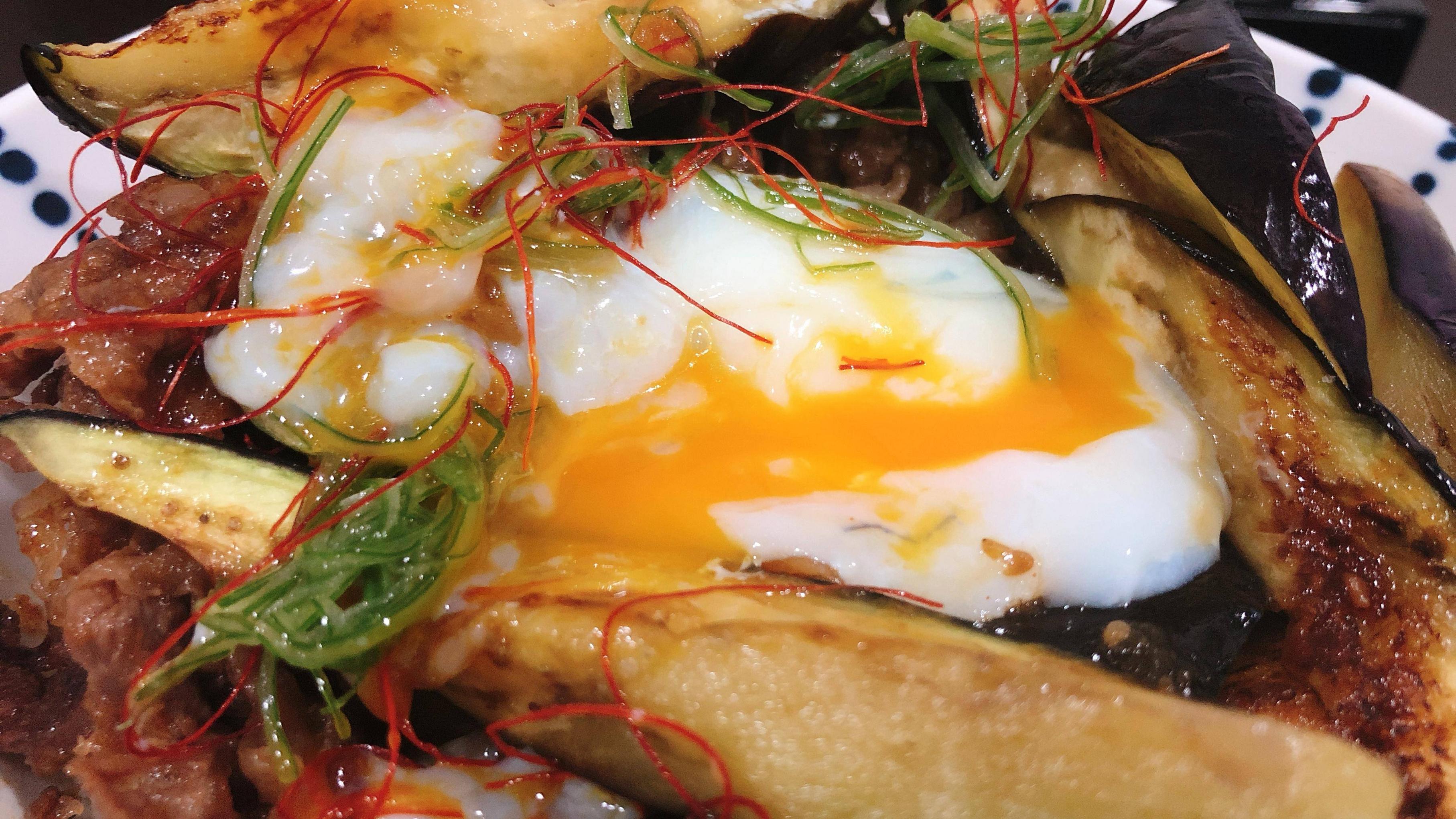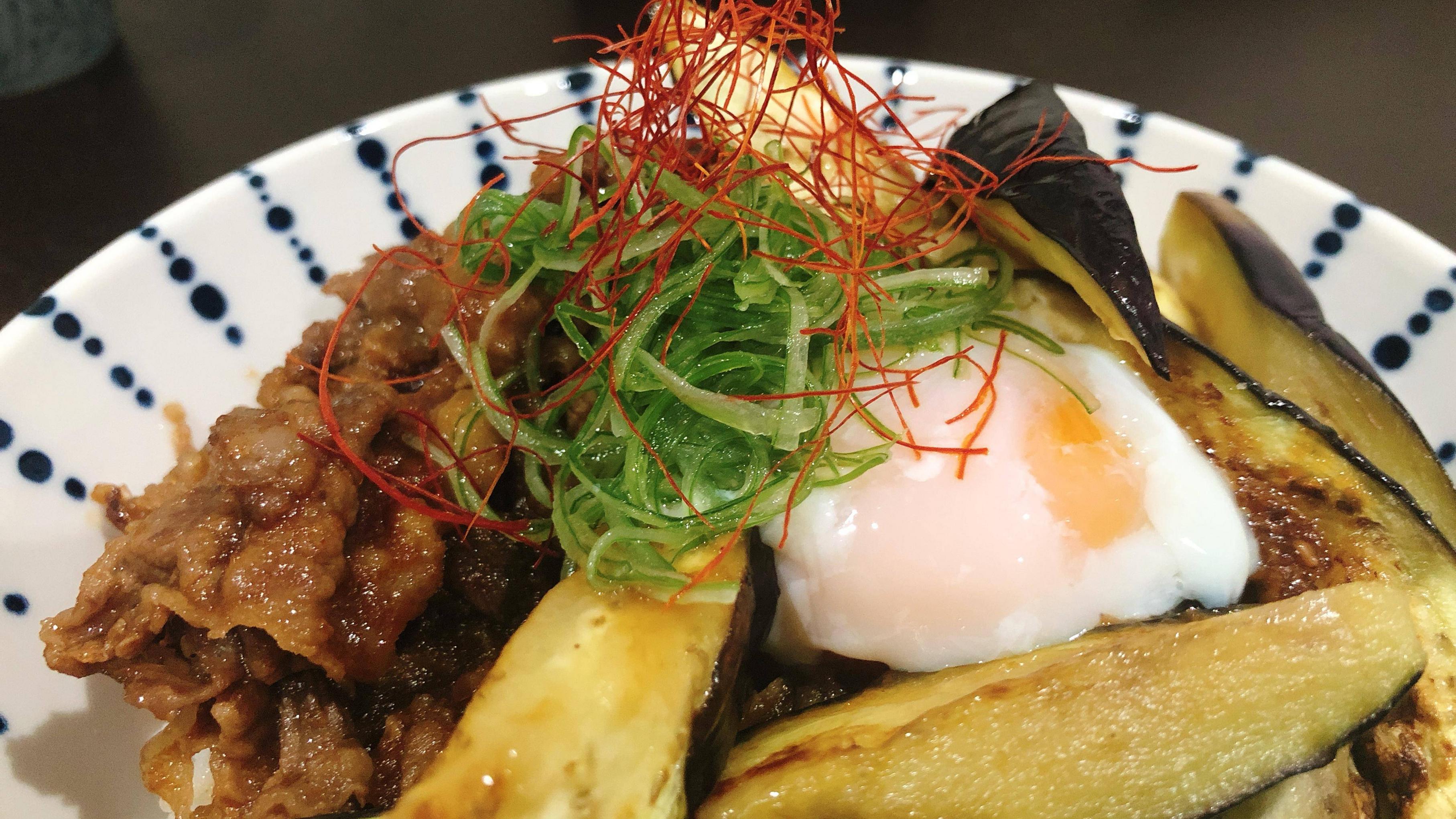 『焼肉丼(追加ー焼き茄子、温泉卵)』