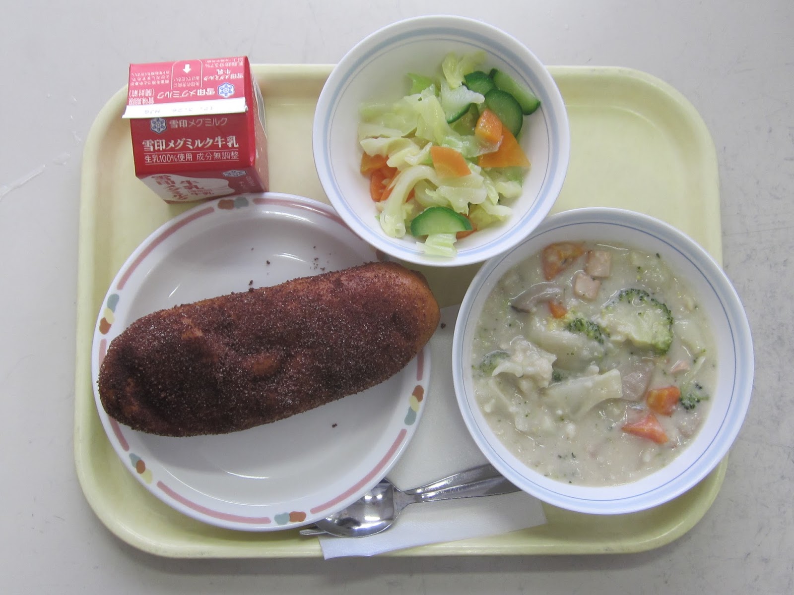ていうか今の給食って銀色のお皿じゃないんだな!自分の頃はお皿もお盆も全部銀色の何かだった。牛乳も三角だったし。