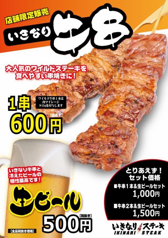 いきなり!ステーキ「牛串+ビール」一部店舗でスタート