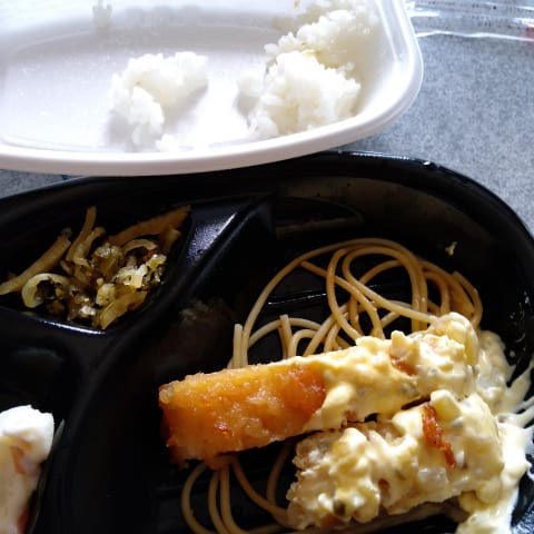 このおかずの下にあるスパゲティがまた美味いんよなぁ