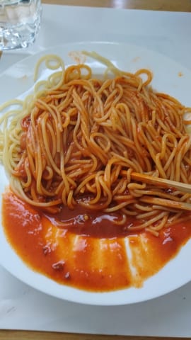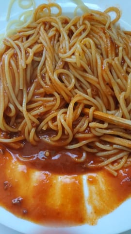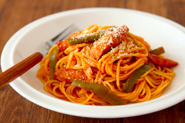 ピーマンと玉ねぎとベーコンorウインナーのナポリタンかと思ったら68円くらいのミートソースもどきか