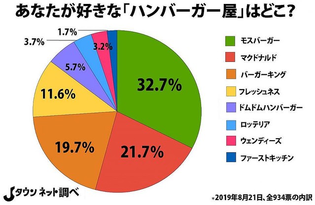 時々無性に食べたくなるハンバーガー。安い価格でお手軽に買うことができ、種類も豊富なファストフードだ。日本でも圧倒的な店舗数を誇る「マクドナルド」を始めとし、多くのチェーン店が展開している。 店舗数や知名度でいえばマクドナルドが群を抜いているといっても過言ではないが、日本発祥の「モスバーガー」、日本で最初のハンバーガーチェーン「ドムドムハンバーガー」などもファン層は厚い。好きなハンバーガー屋を問われると迷ってしまう人もいるのではないだろうか。 そこでJタウンネット編集部は2019年2月9日から8月21日にかけて、「あなたが好きな『ハンバーガー屋」はどこ?』という質問で読者アンケートを実施してきた(総得票数:934票)。 はたして、一番人気だったのは――? ■1位、2位で過半数を占める 選択肢は「マクドナルド」「モスバーガー」「ロッテリア」「バーガーキング」「フレッシュネス」「ウェンディーズ」「ファーストキッチン」「ドムドムハンバーガー」の7店。 まずは全国的に人気のチェーン店を見ていこう。 一番人気だったのは「モスバーガー」で32.7%(305票)。圧倒的店舗数を誇るマクドナルドを抜く形となった。続いて「マクドナルド」は21.7%(203票)、「バーガーキング」が19.7%(184票)、「フレッシュネス」が11.6%(108)の順になっている。 モスバーガーとマクドナルドで過半数を占めており、2強といったところだ。 驚いたことに、バーガーキングは地方での出店が少ないにも関わらず、3位という健闘ぶり。19.7%と2位のマクドナルドと僅差だ。東京のアンケート結果を見ると、603人中152人(25.2%)がバーガーキングと回答し、マクドナルドの19.1%を上回る結果となっている。 ツイッターでは、  「細かいオーダーに応じてくれるからバーキンは好きです」  「肉々しいパティ、好きです」  「やっぱワッパーは美味しい。トマト追加かタマネギ追加が個人的に好き」 といった声が寄せられており、「とてつもなく大きい」を意味する看板商品のハンバーガー「ワッパー」、さらにパティや野菜、ソースを有料で追加できることが、それぞれ魅力の一つにあるようだ。 続きはソース https://news.livedoor.com/article/detail/16968074/ 画像