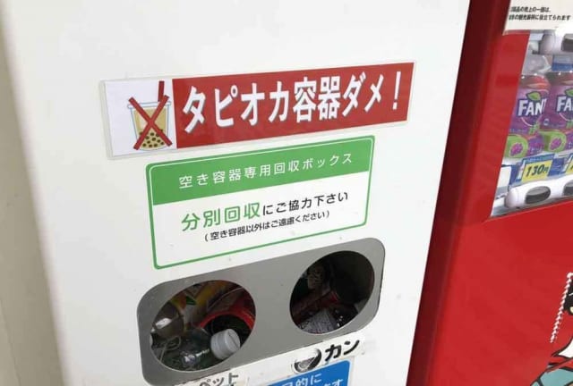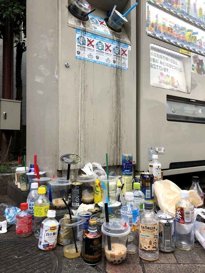 タピオカのカップ片手に食べ歩きする姿も。自販機用に設置されたごみ箱は、無理に突っ込まれたタピオカ容器で投入口がふさがれ、周囲には黒い粒の食べ残しが目立つカップやペットボトルが散乱していた。