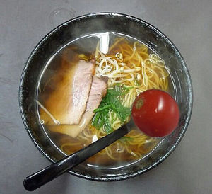 豚骨ラーメンとカレーうどんのハーフハーフでミニトマトトッピングや