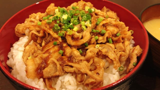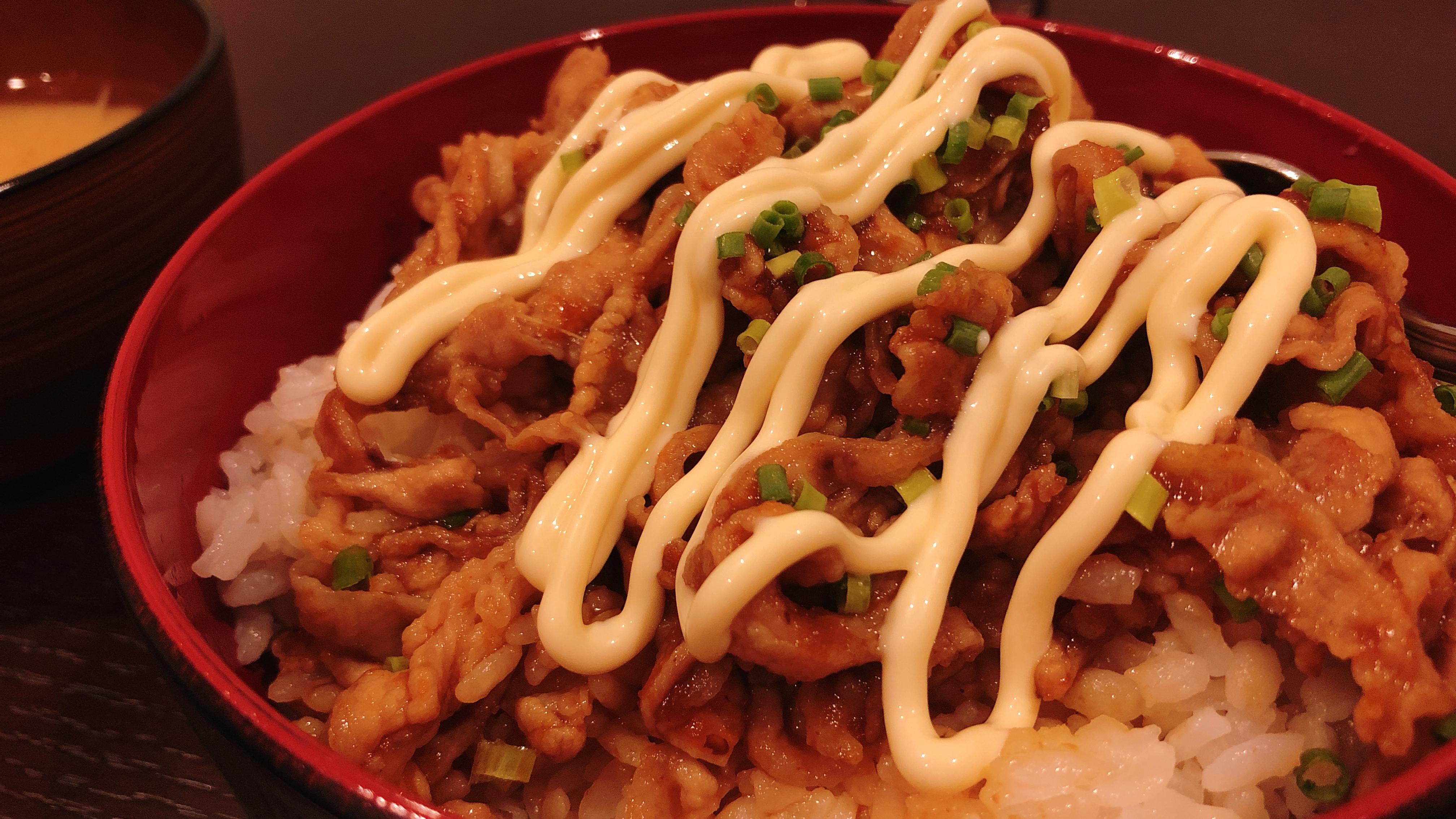 米に焼肉のタレで炒めた豚バラスライス乗せたんやで