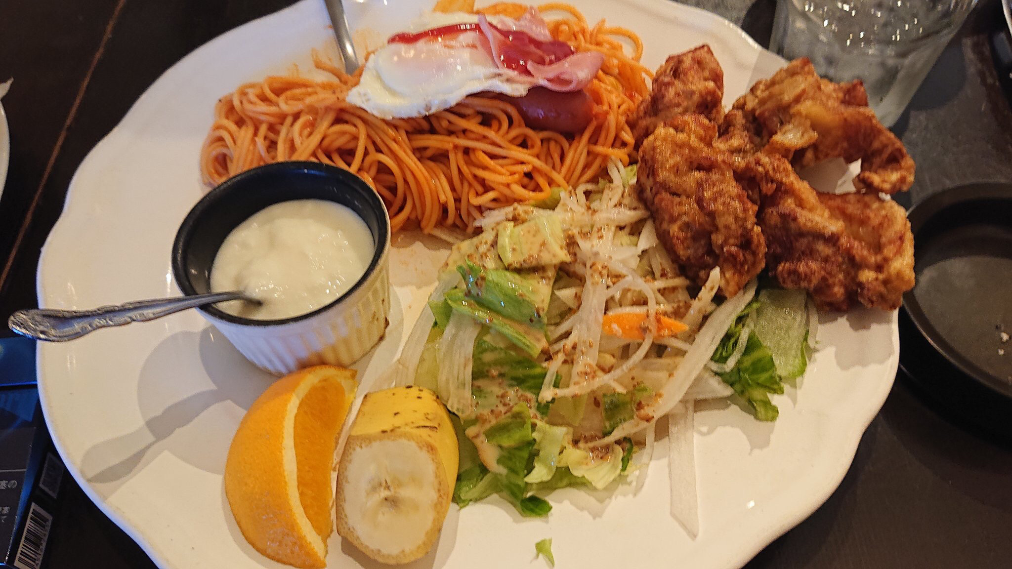 唐揚げもどきとフルーツ削除、ナポリタン3倍に増量、サラダにプチトマト追加席料なし¥650、コーヒーは出来合いなら+¥50手間かかってるなら+¥100。