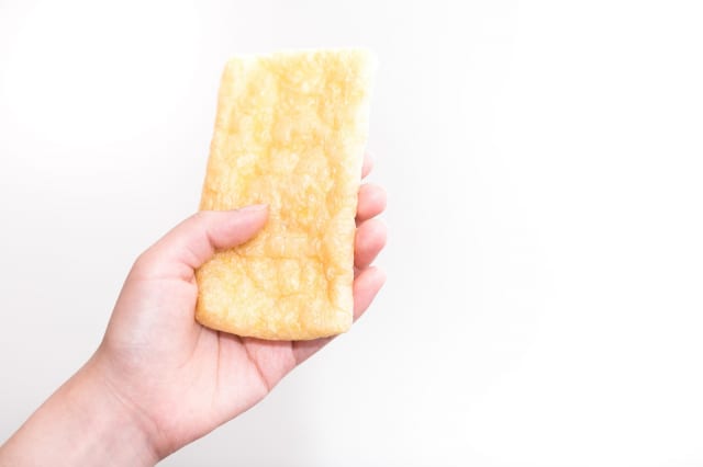 熱湯をかけると油揚げが驚くほど楽にキレイに開きやすくなる。