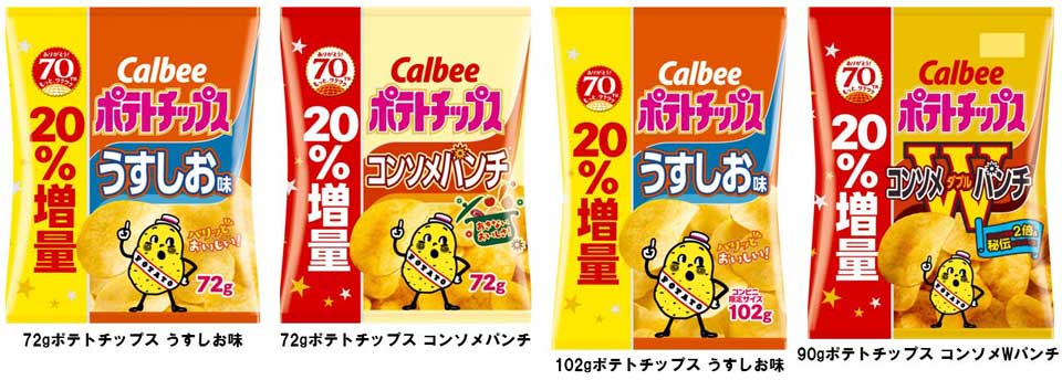 カルビーの「ポテトチップス」4品、「うすしお味(60g)」「コンソメパンチ(60g)」「うすしお味(85g)」「コンソメWパンチ(75g)」が9月下旬から20%増量されます。