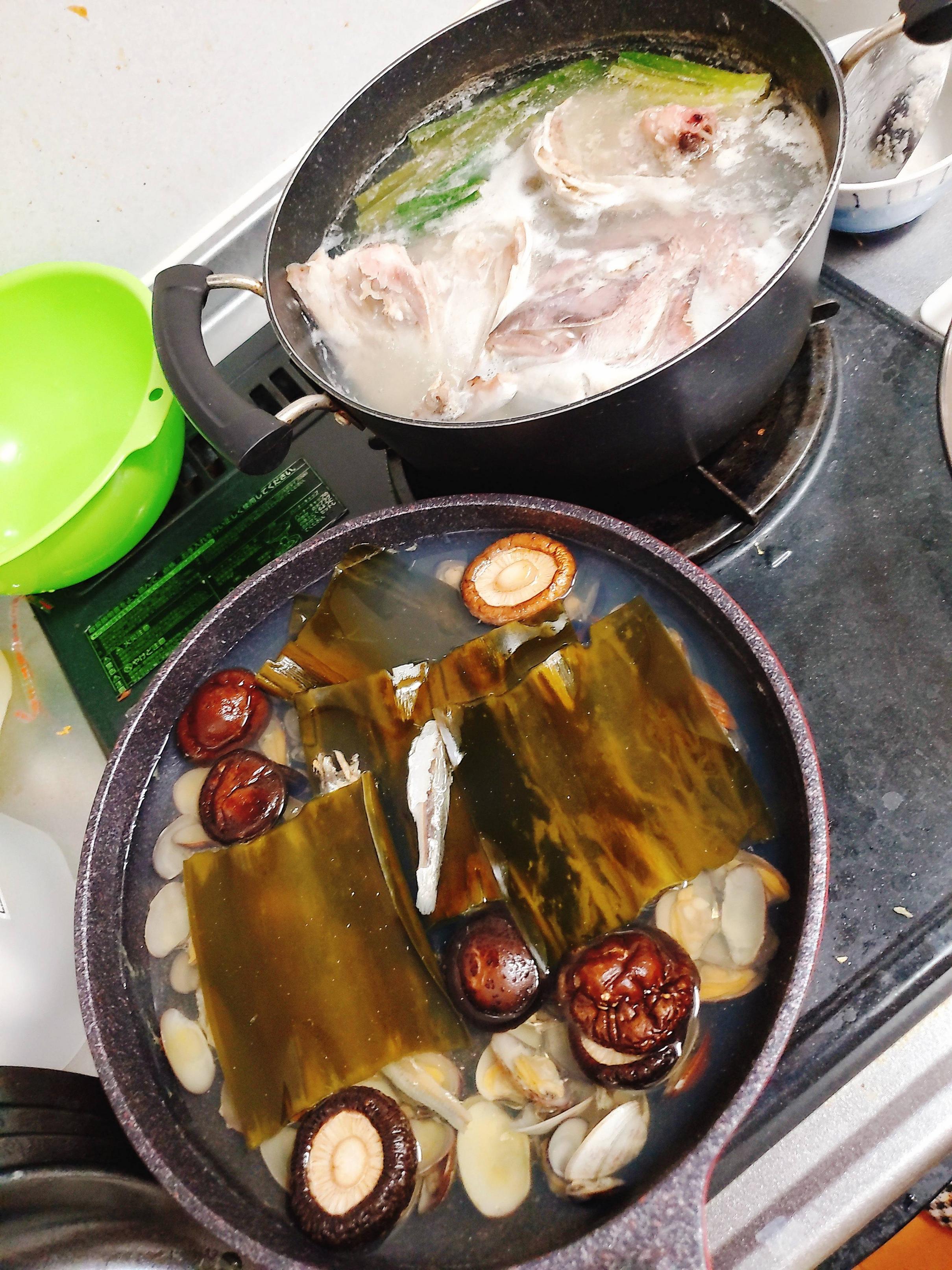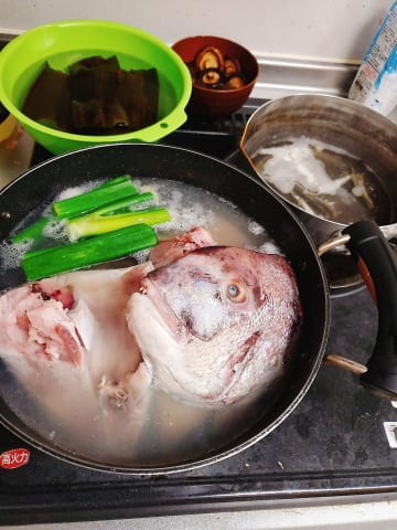 その間に鯛の頭とネギの青いところを一緒に煮ていく!