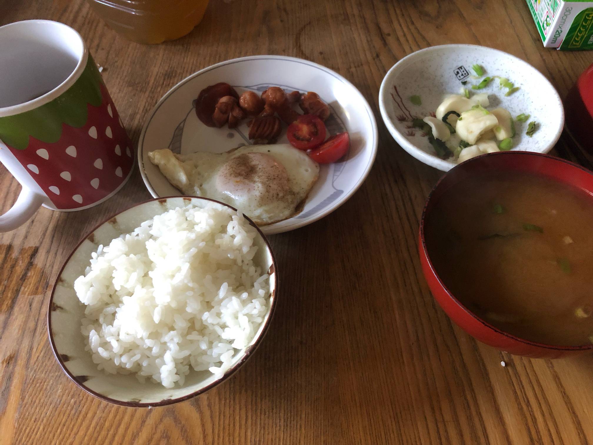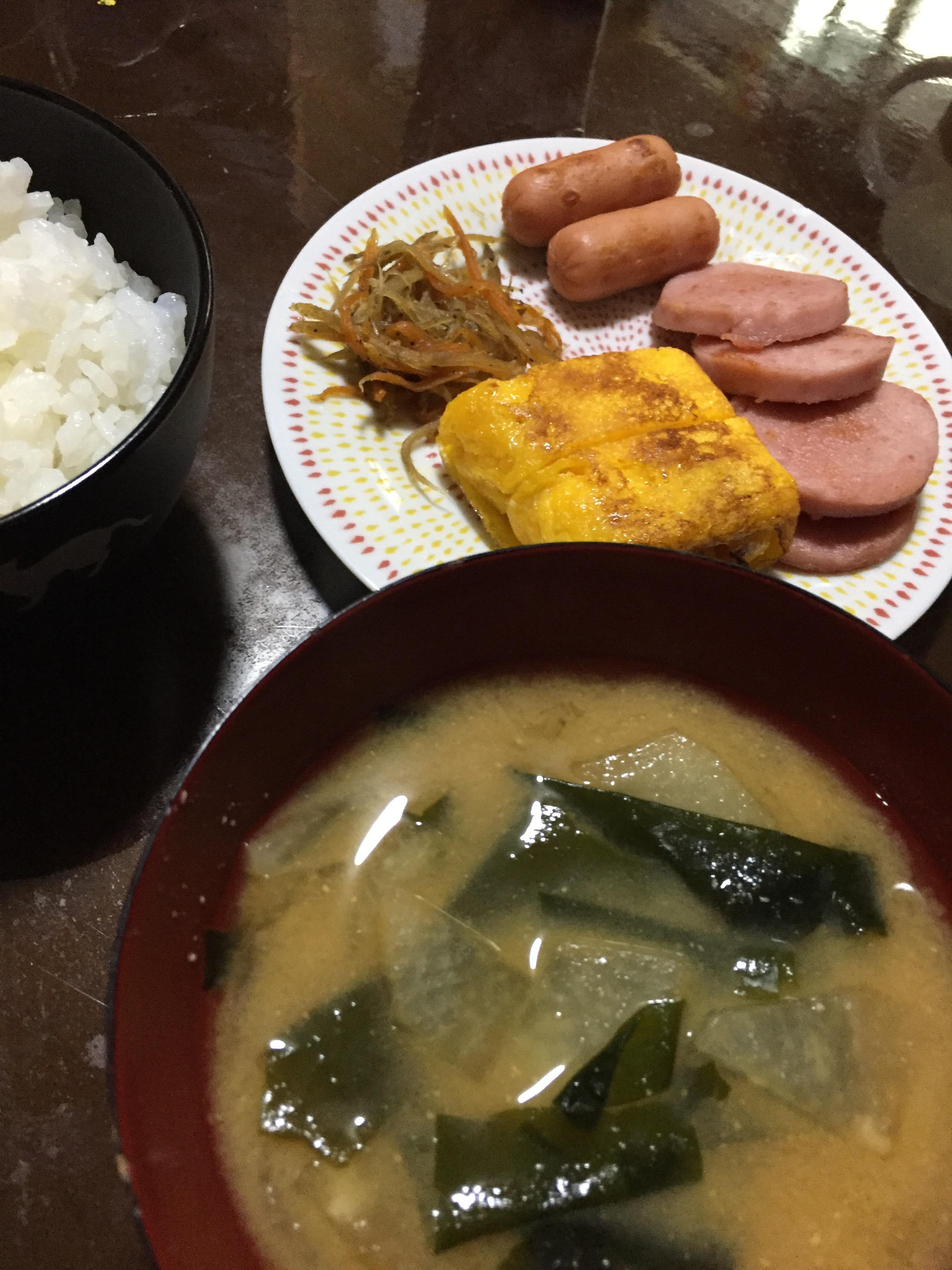 ご飯に味噌汁、海苔、漬け物。あといりこ炒ったのとかメザシがあれば文句ない。昼はパンか麺かご飯ならチャーハンとかチキンライスがいいな。