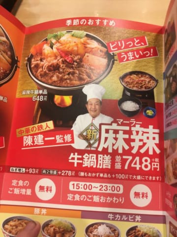 【画像】吉野家の新商品、麻辣牛鍋膳 (並盛 税別748円)をご覧下さい