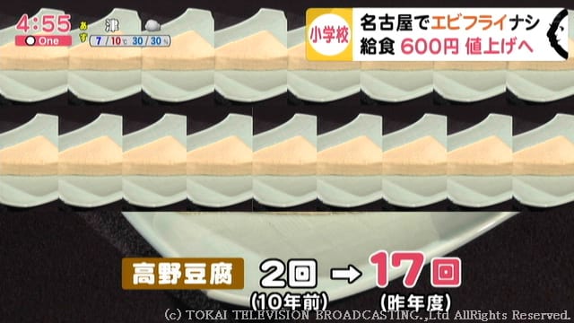 “切干大根”など急増…児童「肉食べたい」食材高騰で質素に 小学校の給食費を名古屋市が値上げへ  名古屋市教育委員会は来年度から食材費の高騰を受け、市立小学校の給食費を600円値上げし、4400円とすることにしました。 【画像で見る】質素すぎる名古屋の給食…この10年で起きていた変化 https://www.tokai-tv.com/newsone/photo/20191205-nagoyanokyusyoku.html