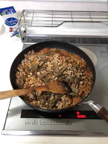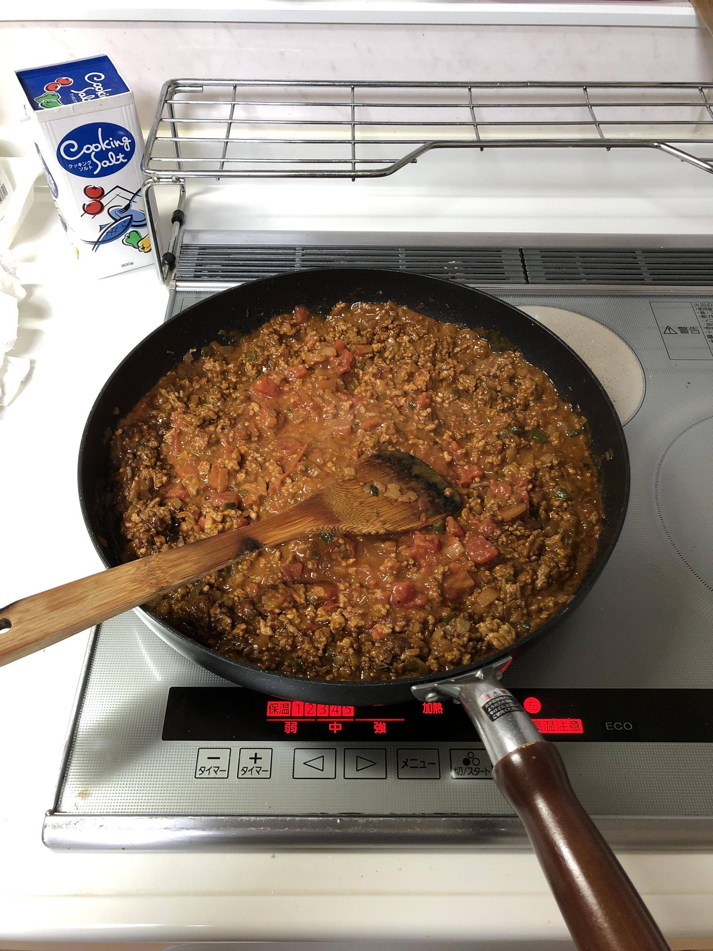 ひき肉ケチって玉ねぎ多めにして、折角だから人参とセロリも超細かく刻んで入れて、トマト缶詰丸ごと入れて、あら不思議カレー風ミートソースになってしまったことあるわ。