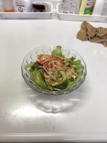 サラダは玉ねぎと赤ピーマンとレタスを盛るか