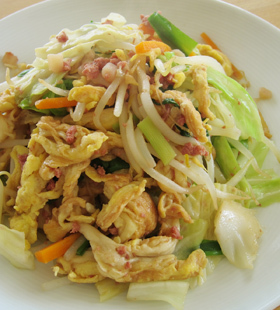 代表料理がスパムorツナ缶と⚪⚪炒め、本だしをお湯に溶いて中華麺を浮かべました。