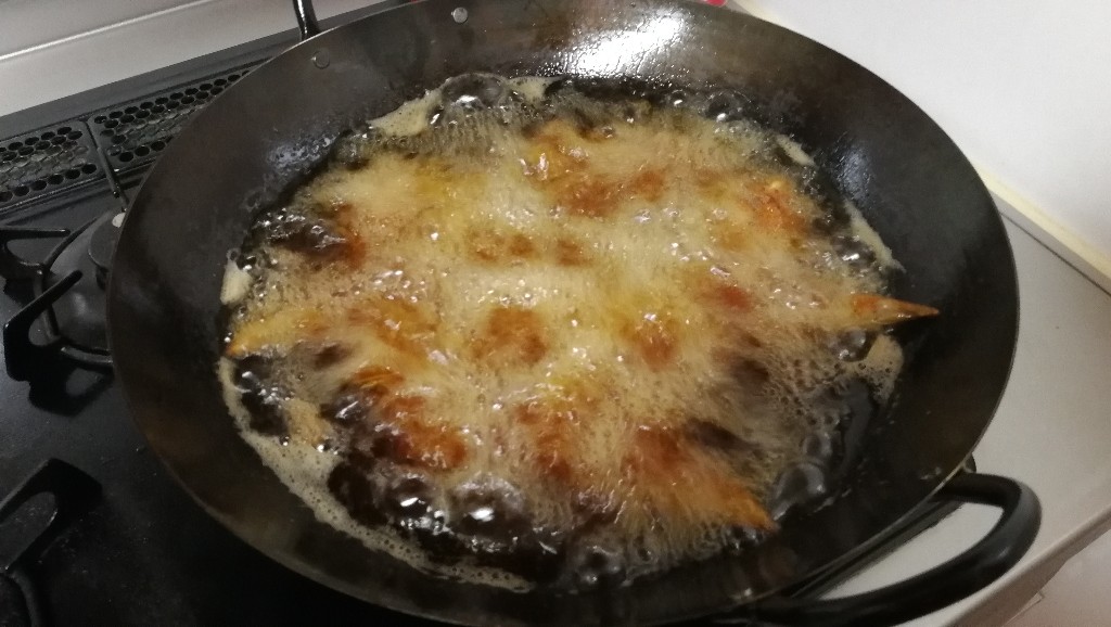 自宅でやると油が勿体ないから、揚げるというより炒める感じになる。