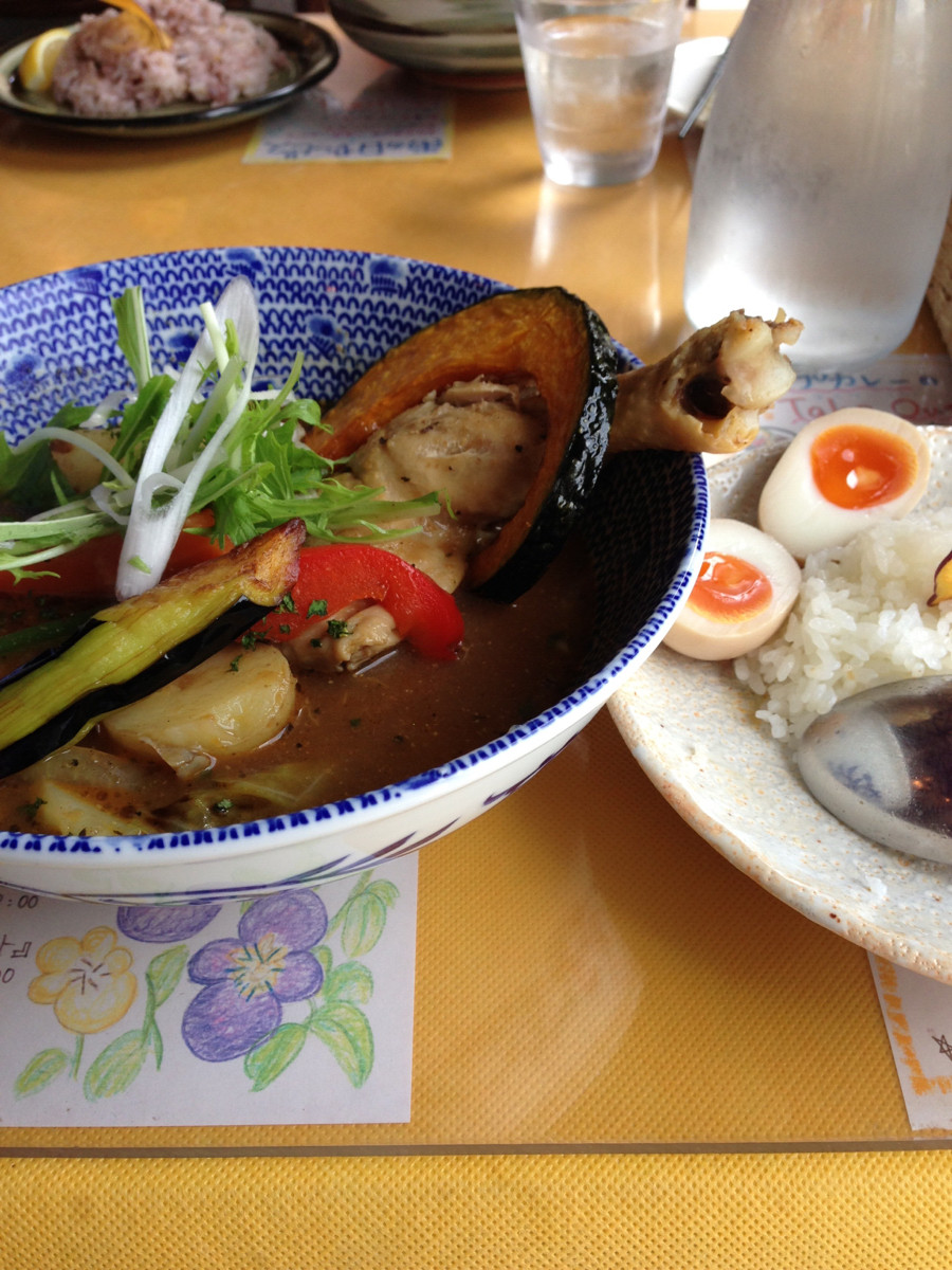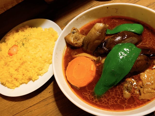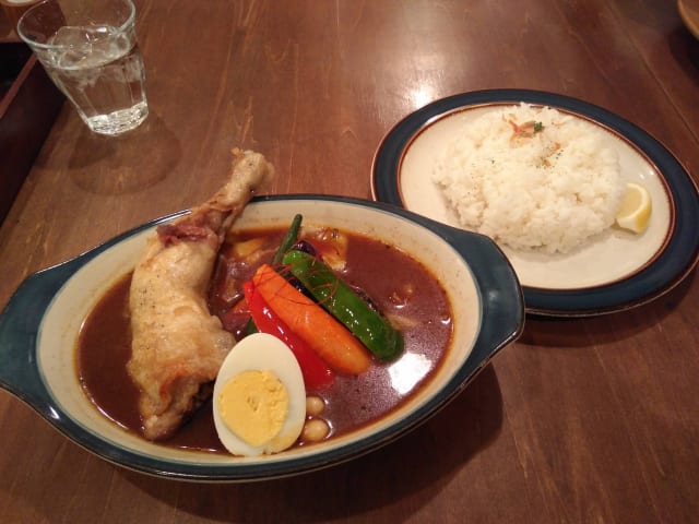 一口も食えない様な激辛で具がパリパリに揚げたチキンしかない上に、ガーリックとスパイス効きまくってるスープカレーが美味いんだよ。よくある女の食いもんなんか?^q^的なゴロゴロ野菜のイメージが悪過ぎる。