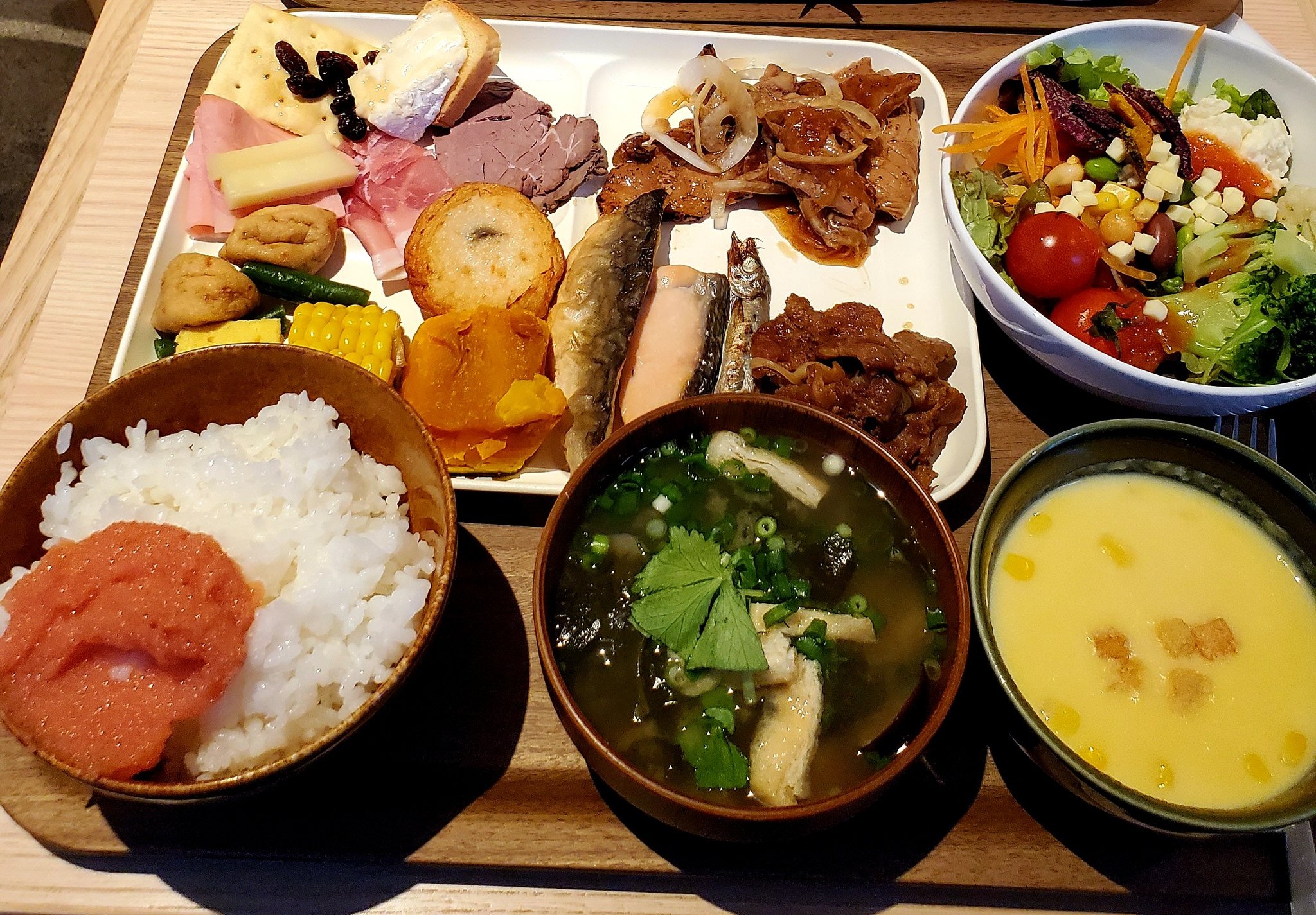 右下はコーンスープか?味噌汁もあるしよくわからん