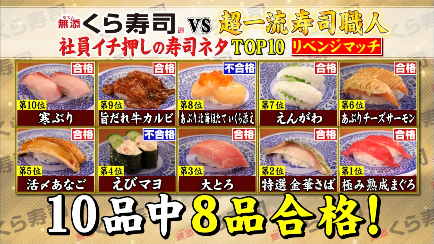 >>10 くら寿司のメニューを一流寿司職人が判定するって企画で 合格=認めてやるってことや